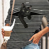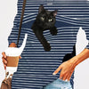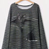 Black Cat Print Long Sleeve Round Neck White Striped Plus Size T-shirt