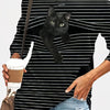 Black Feline Pattern Long Sleeve Striped White Round Neck Plus Size Tee