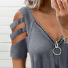 Upgrade your casual wardrobe with our Cold Shoulder Cutout Sleeve Zip Front Top. This stylish top offers a perfect blend of trendiness and comfort, making it a must-have for the upcoming summer season.