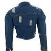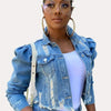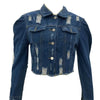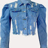 Ripped Raw Hem Puff Sleeve Pocket Cropped Denim Jacket