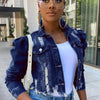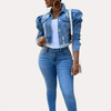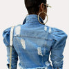 This Ripped Raw Hem Puff Sleeve Pocket Cropped Denim Jacket is a must-have for fashion-forward individuals who want to make a bold statement.