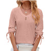 A V-neck three-quarter sleeve buttoned drawstring loose T-shirt top is a premium women's casual garment featuring a flattering V-neckline, three-quarter sleeves for versatile coverage, a buttoned placket for adjustability, and a drawstring hem for customizable fit. Crafted from 100% GOTS-certified organic cotton, it offers luxury comfort, breathability, and a relaxed yet elegant silhouette suitable for everyday wear.